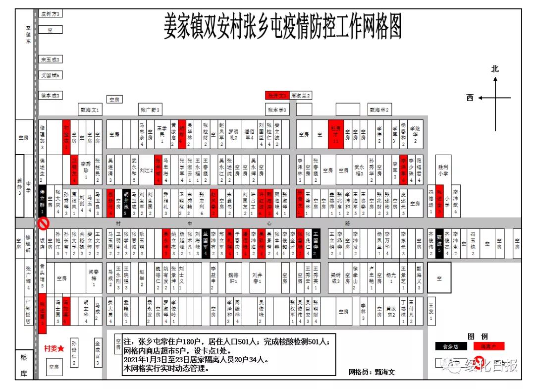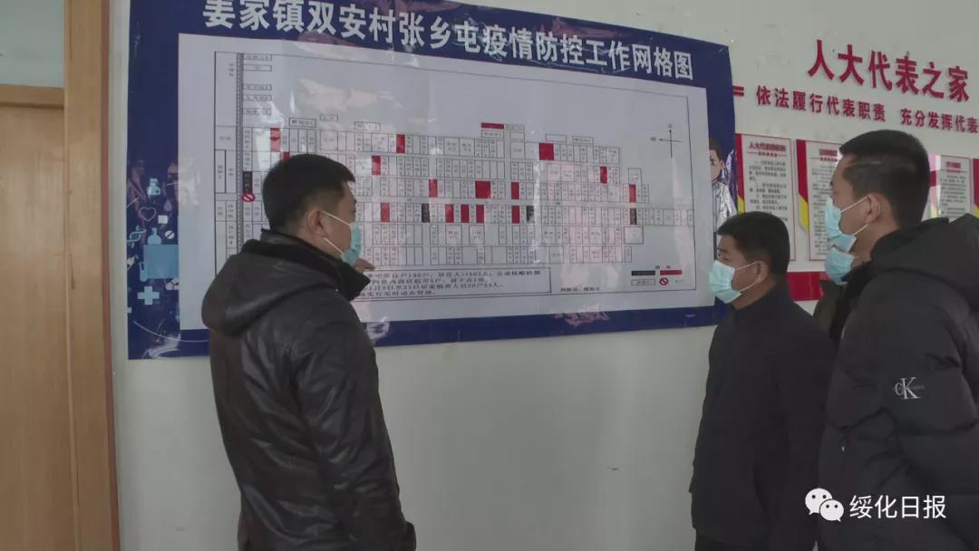 在姜家鎮政府辦公室墻上懸掛的一張姜家鎮雙安村張鄉屯疫情防控工作網格圖格外顯眼。鎮黨委書記生振明指著網格圖,向鎮村干部了解居家隔離人員具體情況。