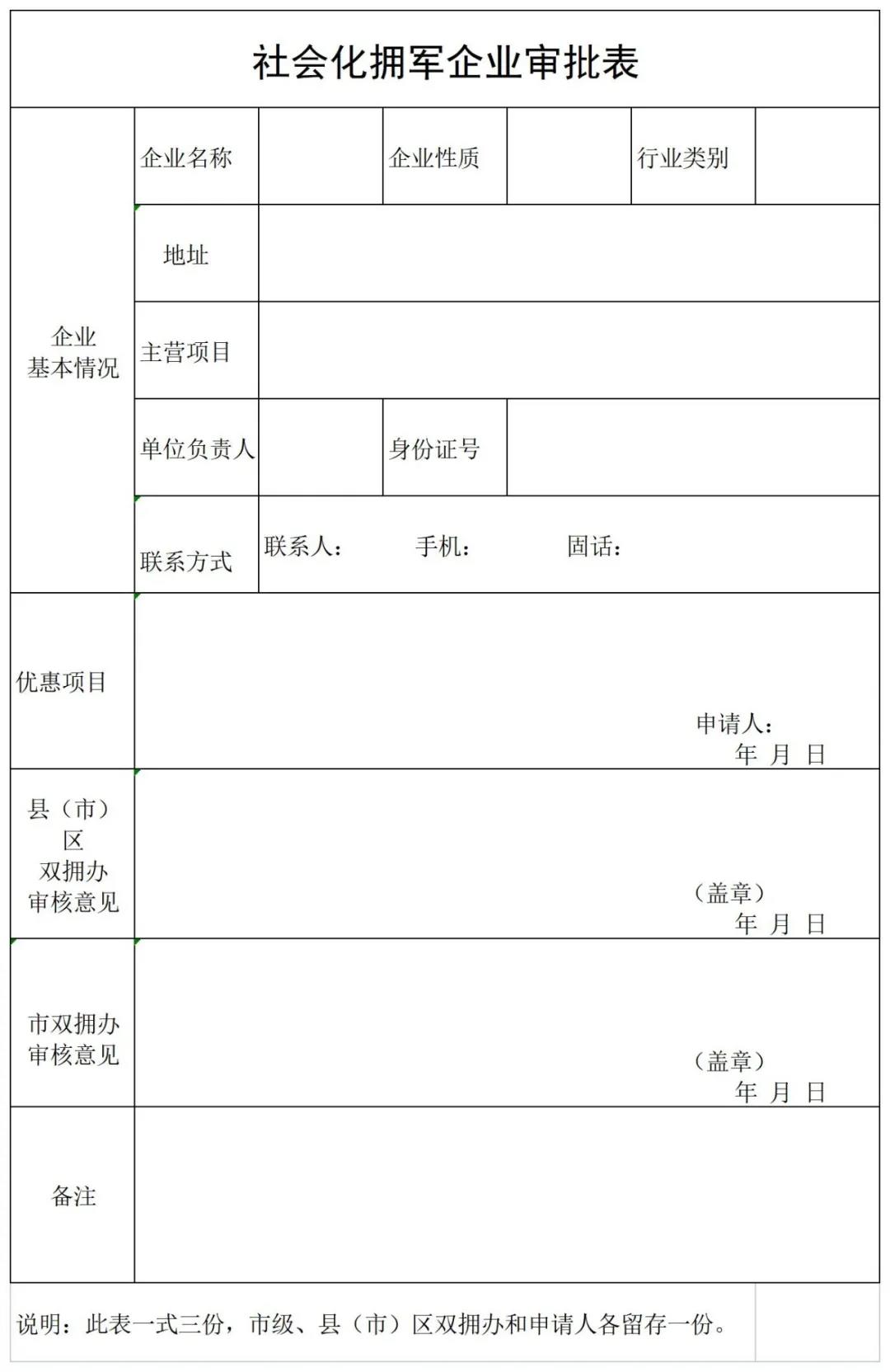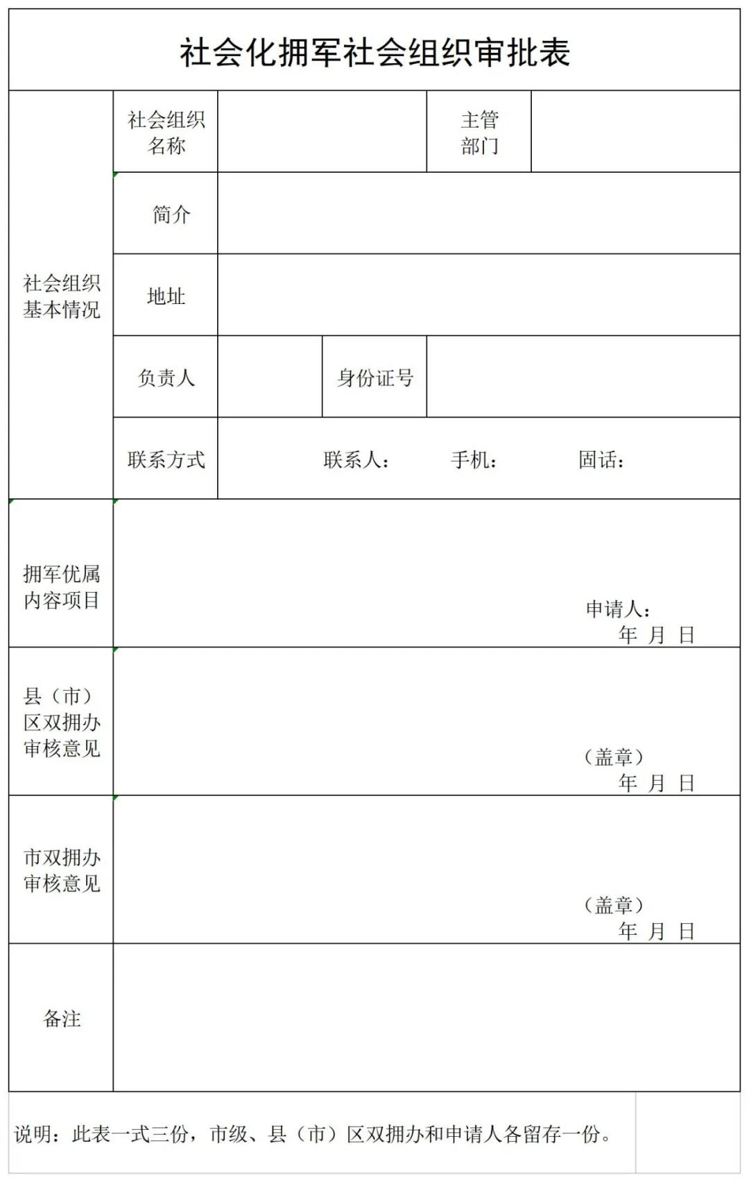1.申請加入社會化擁軍的企業要明確擁軍優屬的優惠項目,社會組織要明確參與擁軍優屬活動的內容項目。