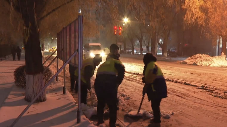 11月8日,入冬后的首場降雪,降雪量大、積雪厚,為切實保障城市正常運轉、居民出行安全,市城市管理綜合執法局第一時間組織環衛工人投入一線開展清雪作業,并組織進行了“挑燈夜戰”“連軸轉”清雪,采取人機結合、人員輪班上崗、清雪車輛不停的作業方式,增加清掃力度,最大限度清除路面積雪,全力以赴確保人民群眾出行安全。