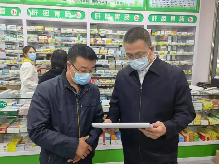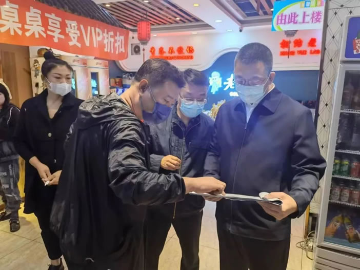 單奎副市長一行重點檢查了餐飲、藥店以及鴻泰水果批發市場、陽光農貿市場等業態,對各場所進門測溫、掃碼、戴口罩以及消殺等防控措施執行情況進行了細致檢查。