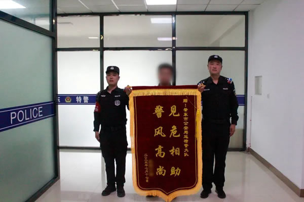 8月10日,齊齊哈爾市民張先生來到肇東市公安局巡特警大隊,將一面印有“見危相助,警風(fēng)高尚”的錦旗送到巡特警隊員手中,以表感激之情。