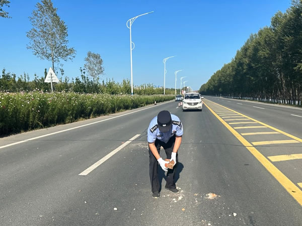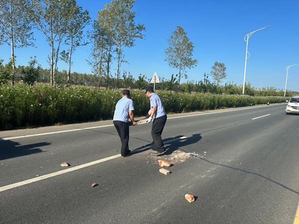9月2日15時,肇東鎮(zhèn)派出所在轄區(qū)環(huán)南環(huán)路八道街至五岔路口巡邏時發(fā)現(xiàn)路面有過往運輸殘土車輛遺落的混凝土磚塊等殘土,存在嚴重道路交通隱患, 容易引發(fā)道路交通事故,嚴重影響過往車輛正常通行和駕駛?cè)藛T安全。派出所巡邏民輔警第一時間設(shè)立交通反光錐,緩行指示牌,在提醒過往車輛注意行車安全減速慢行的同時,及時清理遺落的殘土,確保道路行車安全,受到過往群眾一致好評。