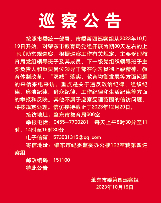 2023年10月19日上午,市委第四巡察組對市教育局黨組巡察工作動員會議在市教育局召開。市委巡察工作領導小組成員劉向軍,市委第四巡察組組長李偉宏出席會議并講話,對此次巡察工作的重大意義、目標任務、方法步驟做出了具體要求。