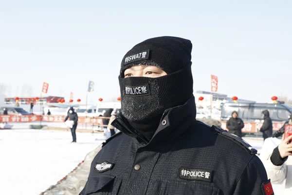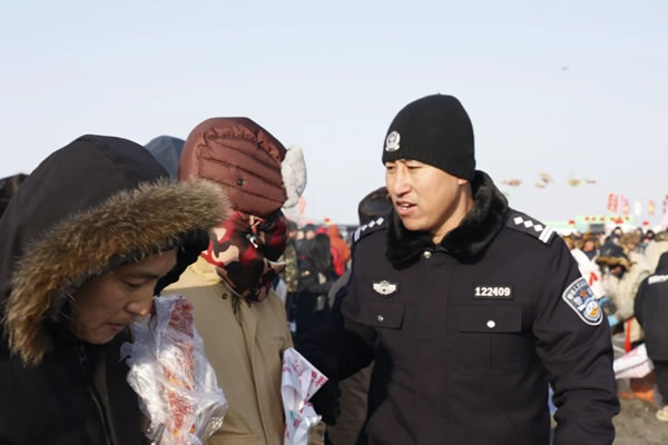 由于捕魚時湖面上打下了很多“冰眼”,為了防止群眾距離出魚口過近掉入“冰眼”,執(zhí)勤民警合力將“冰眼”守護起來,疏導圍觀群眾保持安全距離。執(zhí)勤過程中,民警們不畏嚴寒、頑強作戰(zhàn),組織、疏導現(xiàn)場群眾有序觀看捕魚,有效防止了意外事故的發(fā)生。