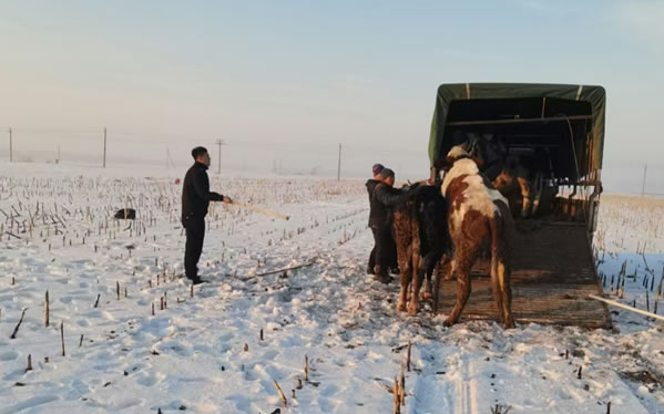 民警了解情況后為了避免瘋牛在村屯里傷害群眾,便立即組織人員開車拿著棒子等工具將瘋牛趕到了屯后的大地里。工作人員幾次試圖靠近瘋牛,但瘋牛看見有人靠近就會向人沖過來,工作人員在幾次奔跑驅(qū)趕中摔倒在了雪地里。工作人員顧不上個人安危,但考慮到采取強攻制服瘋牛的策略勢必會造成人員損傷,經(jīng)過研究準(zhǔn)備采取智取方式制服瘋牛。經(jīng)過近一小時的忙碌后,這時瘋牛的情緒逐漸穩(wěn)定下來了。工作人員見時機成熟,慢慢的靠近老牛,并快速的拽住韁繩,將牛趕上了車。最后大伙一起將牛送回了李老漢的家中。