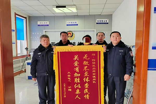 近日,四站鎮(zhèn)菜園子村李某將一面寫有“無微不至體察民情、關(guān)愛有加勝似親人”的錦旗送到了四站派出所所長高劍的手中,以表達(dá)對高劍所長及派出所全體工作人員的感激之情。