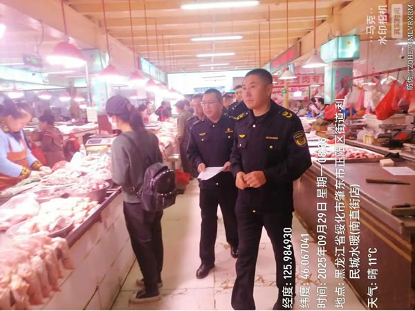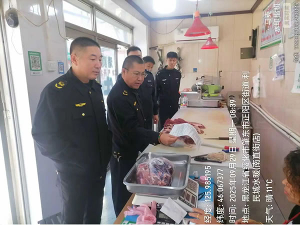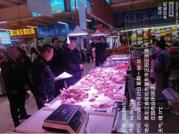 隨著中秋、國慶“兩節”消費旺季臨近,為守護市民餐桌安全、規范節日肉類市場秩序,肇東市農業農村局牽頭,聯合市市場監督管理局、市公安局食藥環偵大隊組建專項執法檢查組,深入城區農貿市場、生鮮超市、肉類專賣店等重點經營場所,開展肉類食品安全聯合執法檢查行動,以“監管+服務+共治”三維發力,為節日市場筑牢安全屏障。
