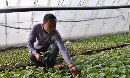 近日,肇東市五站鎮綠園農業生態種植園技術員李曉峰在查看用有機質育苗,等待移栽的黃瓜秧苗!