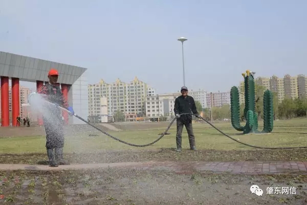 近日,肇東市園林工人正在對道路、公園、綠地等處的串紅、矮牽牛、孔雀草、萬壽菊等花卉進行澆水養護。