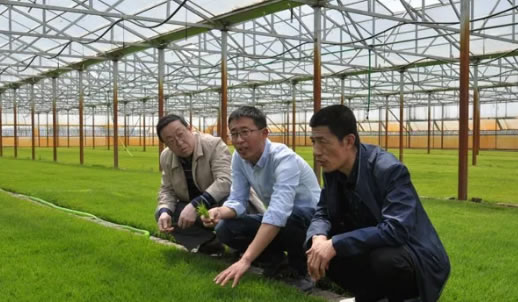 5月10日,肇東市澇洲鎮稻香水稻種植合作社負責人王瑞昌(中)正在和農技人員查看“龍稻18”秧苗長勢。育秧大棚依托自動噴淋系統、補光燈等設備,使1.5萬盤機插秧苗苗齊苗壯,帶動56戶農戶從小拱棚育秧走向智能化育秧。